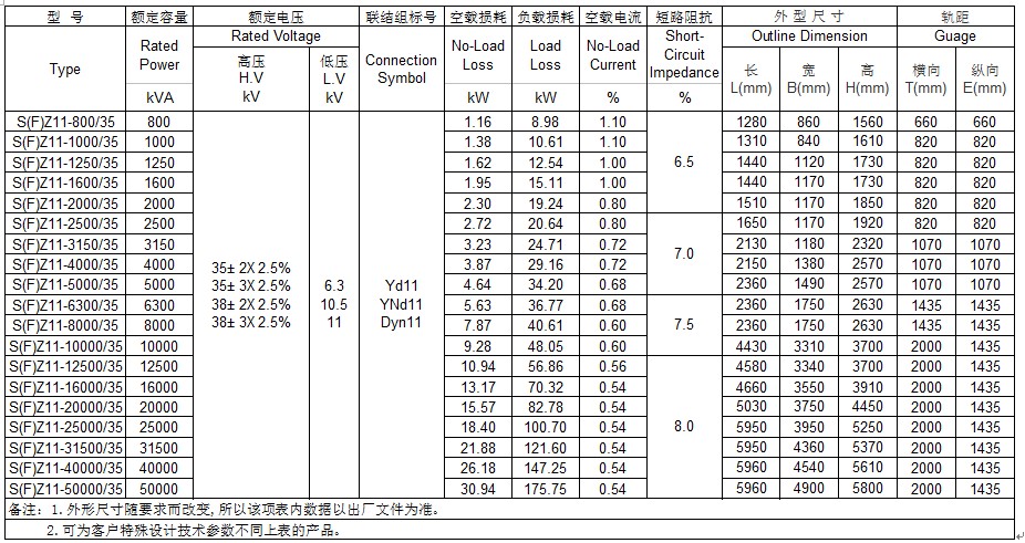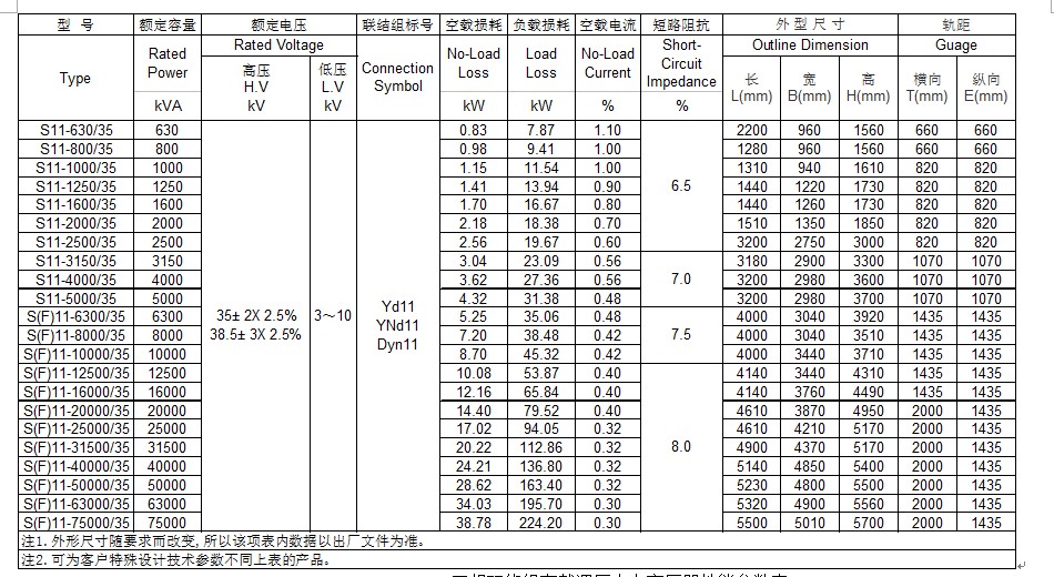 35kV 800~50000kVA三相双绕组有载调压电力变压器性能参数表