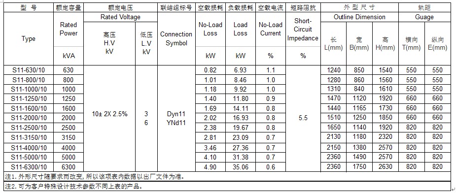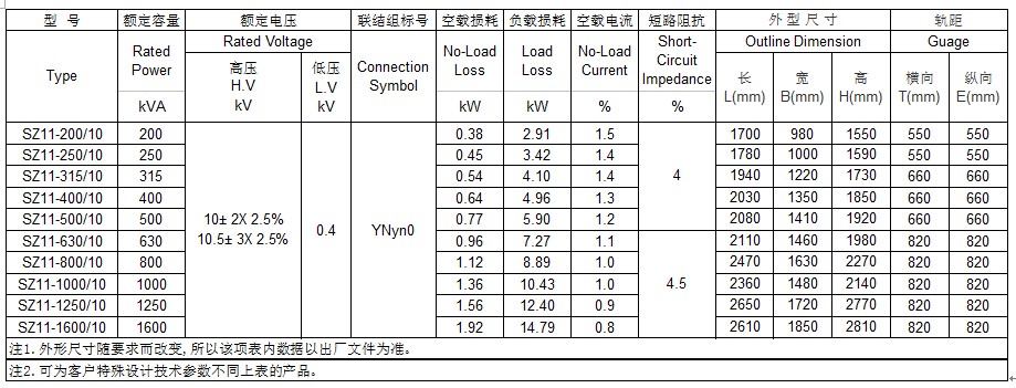 10kV 200~1600kVA三相双绕组有载调压配电变压器性能参数表