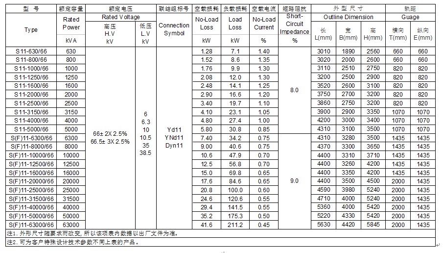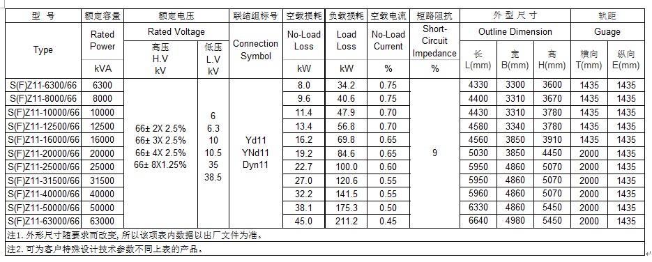 66kV 630~63000kVA三相双绕组无励磁调压电力变压器性能参数表