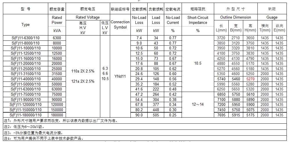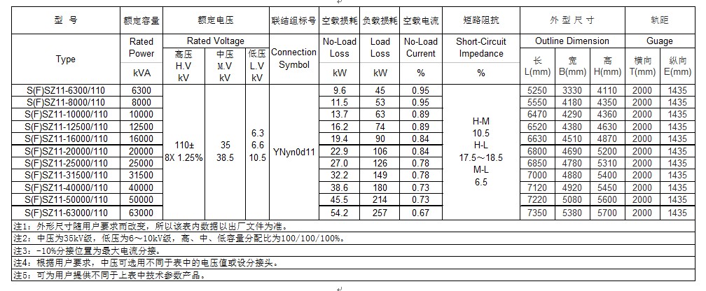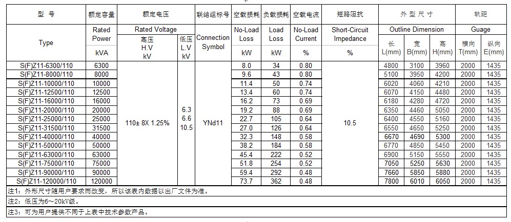 110kV 三相双绕组无励磁调压电力变压器技术数据表