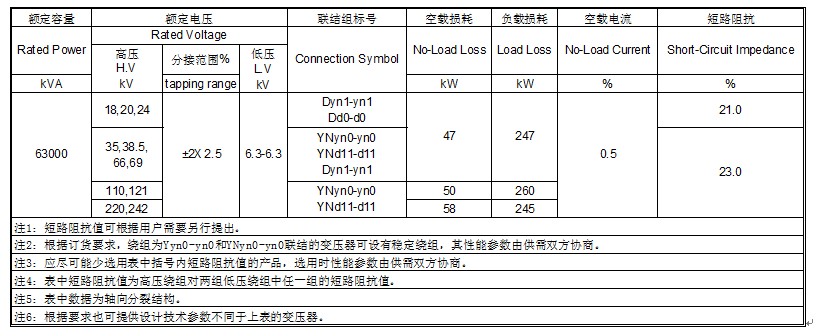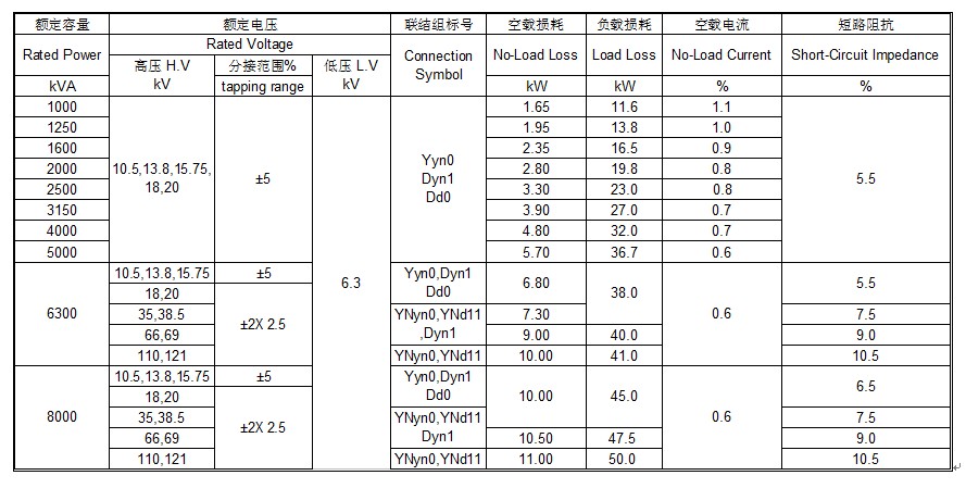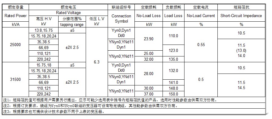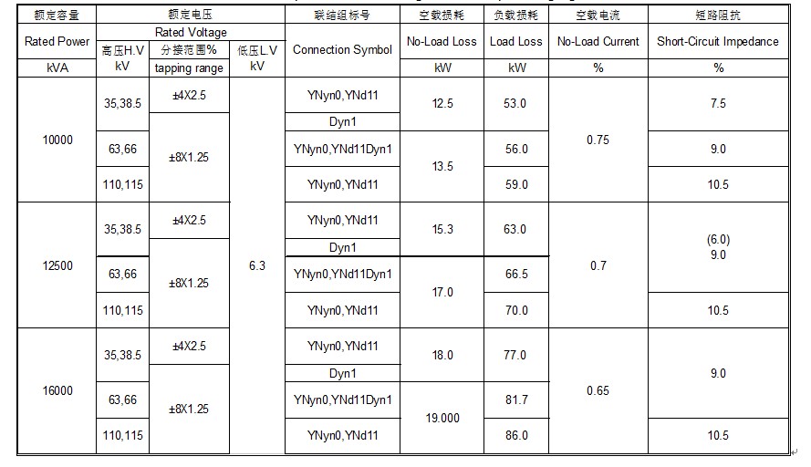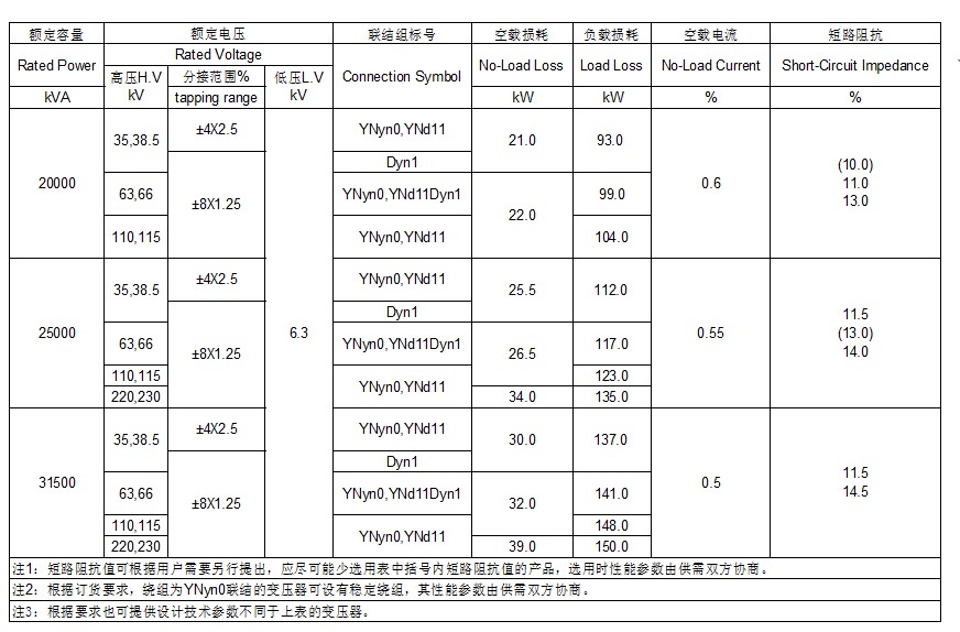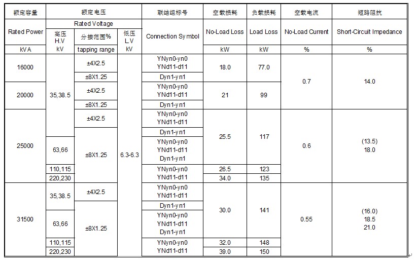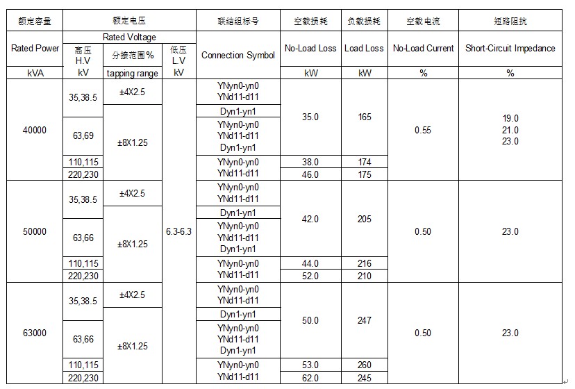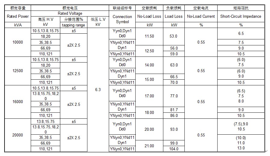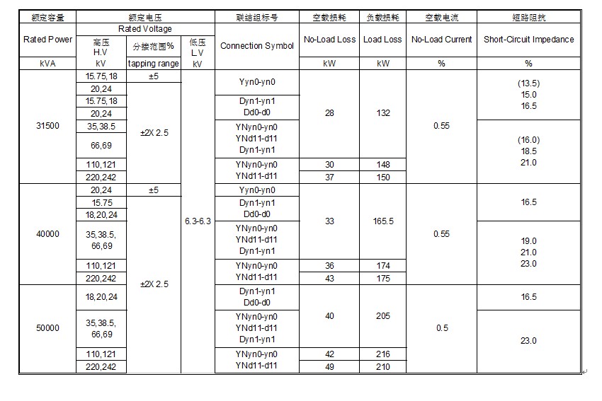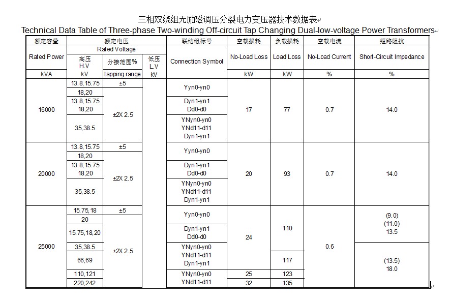Technical Data Table of Three-phase Two-winding Off-circuit Tap Changing Power Transformers