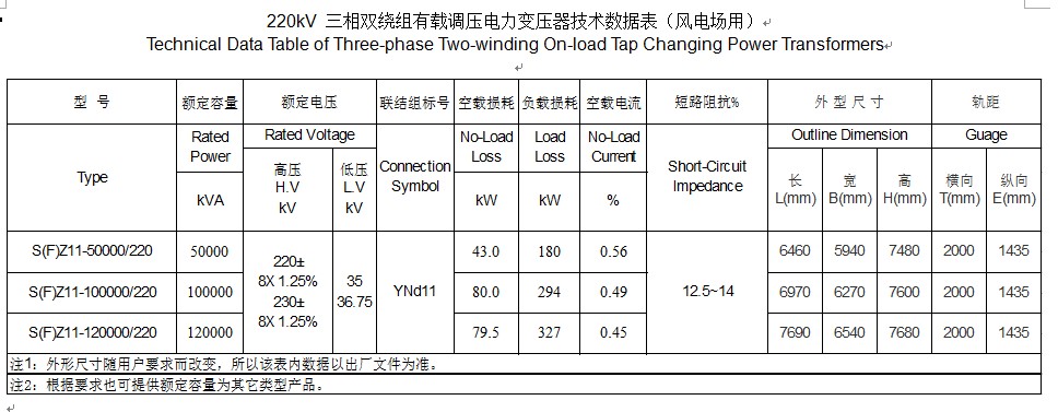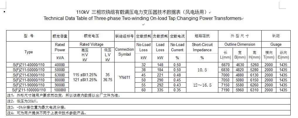 Technical Data Table of Three-phase Two-winding On-load Tap Changing Power Transformers